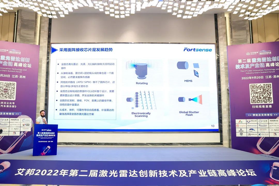 在本次論壇中,阜時(shí)科技CTO王李冬子發(fā)表題為《面陣SPAD在全固態(tài)補(bǔ)盲激光雷達(dá)中的應(yīng)用》的主旨演講。他總結(jié)了激光雷達(dá)行業(yè)的發(fā)展現(xiàn)狀及技術(shù)路線,從阜時(shí)的角度,解讀行業(yè)未來(lái)趨勢(shì),并介紹阜時(shí)科技研發(fā)成果之一——面陣激光雷達(dá)SPAD芯片。該系列芯片主要針對(duì)的應(yīng)用場(chǎng)景是全固態(tài)補(bǔ)盲激光雷達(dá)。